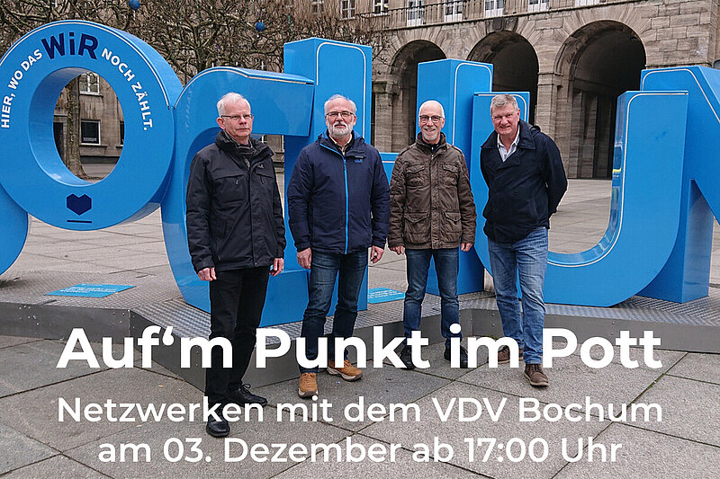 Netzwerken im VDV Bochum: Der nächste Stammtisch findet am Mittwoch, den 03.12.2025 ab 17:00 Uhr in der Gaststätte „Stammhaus Fiege“ , Bongardstr. 23 , 44787 Bochum statt.