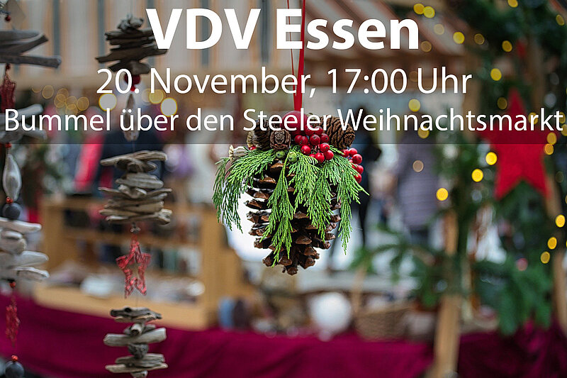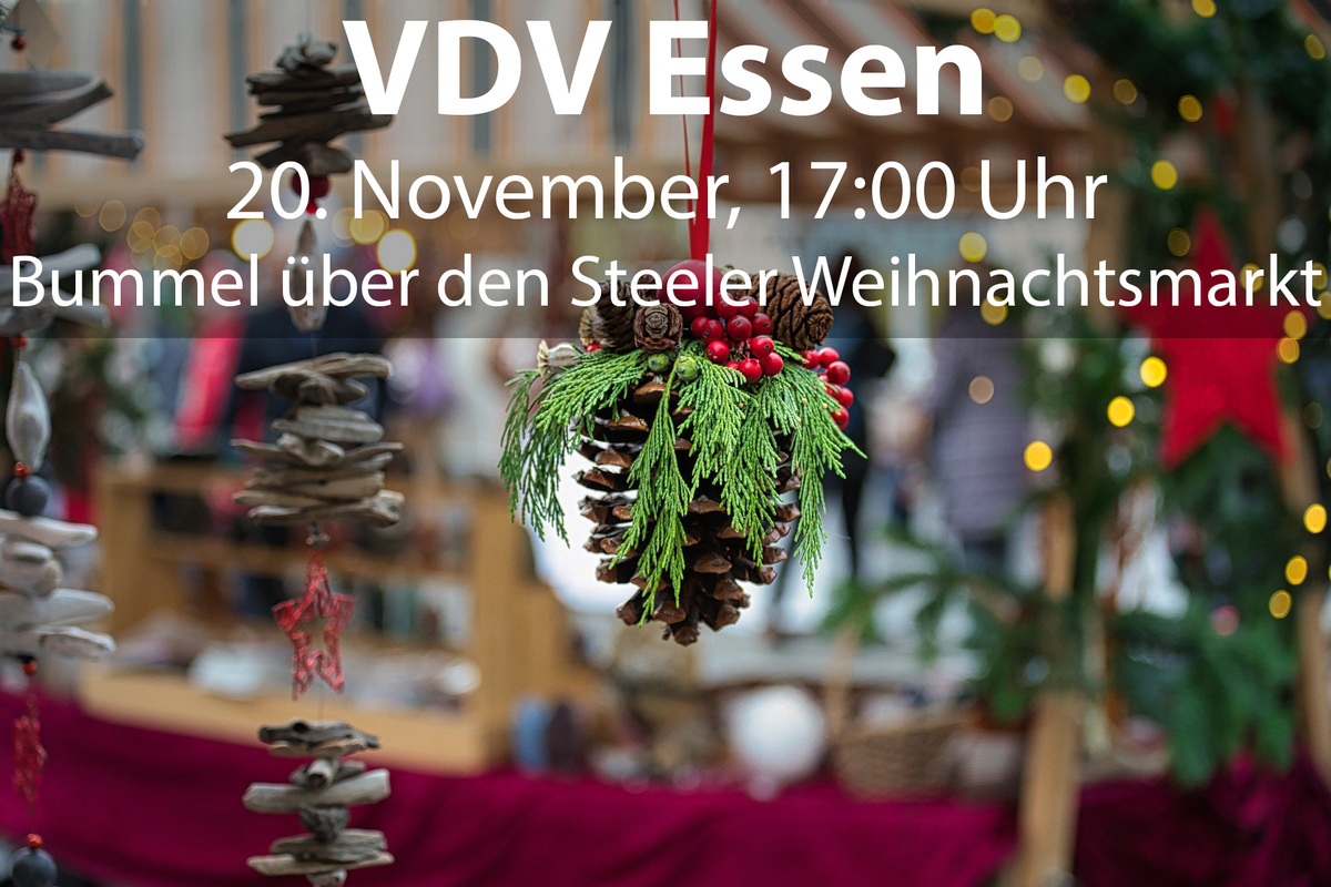 Die Weihnachtszeit steht vor der Tür, und mit ihr die Gelegenheit, Freunde, Familie und auch VDV-Mitglieder auf dem Weihnachtsmarkt zu treffen. Steele startet wie immer früh in die Weihnachtsmarktsaison. Ich würde mich freuen, euch am Donnerstag 20.11.2025 um 17 Uhr in gemütlicher Runde auf einen Glühwein zu treffen. Im Anschluss können wir noch im Ypsilon einkehren und uns dort weiter austauschen.