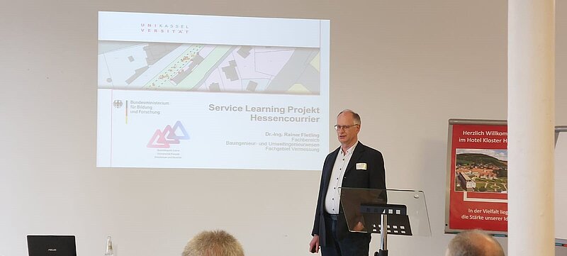Service Learning Projekt Hessencourrier lautete das Thema des ersten Fachvortrages. Es referierte Dr.-Ing. Rainer Fletling von der Universität Kassel. Er ist Fachgebietsleiter Vermessung im Fachbereich Bauingenieur- und Umweltingenieurwesen. Das Fachgebiet Vermessung der Universität Kassel ist im Wesentlichen für die Grundausbildung der Studierenden des Bau- und Umweltingenieurwesens in den Fächer Darstellungstechnik im Modul Baukonstruktion, Vermessungskunde, Einführung in GIS im Modul Bauinformatik, Geoinformationssysteme (GIS) und Ingenieurvermessung zuständig. Darüber hinaus ist das Fachgebiet wissenschaftlicher Dienstleister für geometrieorientierte raumbezogene Informationen für viele Bereiche in der Universität und für Externe. An der Universität Kassel finden in jedem Semester rund 30 fachintegrierte Lehrveranstaltungen mit Service Learning statt – so viele wie an keiner anderen Hochschule Deutschlands. Service Learning als Lehr-/Lernmethode wird in allen Fachbereichen realisiert.