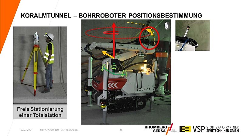 Helga Grafinger (Rhomberg Sersa Rail Group, Villach) und Patrick Schwalbe (VSP Stolitzka & Partner Ziviltechniker GmbH, Wien) stellten mit ihrem gemeinsamen Vortrag „Koralmtunnel – Vermessungstechnische Aufgaben und Lösungen“ Vermessungsaufgaben für die neue Koralmbahn von der Steiermark nach Kärnten in Südösterreich vor. Damit war dieses interessante Großprojekt nach einem Vortrag bei Gleisbau 2011 zum zweiten Mal im Programm. Der 32,9 km lange Koralmtunnel ist neben dem Semmering-Basistunnel (ab 2030) ein wichtiges Teilstück des Baltisch-Adriatischen Korridors im transeuropäischen Eisenbahnnetz (TEN). Seit 2011 hat sich viel getan, inzwischen ist der Tunnel im Rohbau fertig und die Gleise sind verlegt. Momentan erfolgt die bahntechnische Ausrüstung. Die Inbetriebnahme ist aktuell für 2026 geplant. Nach der Projektvorstellung ging Helge Grafinger auf die bautechnischen Aspekte ein. Der Koralmtunnel besteht aus zwei Röhren mit Querschlägen, ist mit fester Fahrbahn und einer Oberleitungsstromschiene ausgestattet. Der Durchstich in beiden Röhren erfolgte Mitte 2010. Für den Vortrieb waren umfangreiche Kontroll- und geotechnische Messungen auszuführen. Beide Röhren wurde im Rohbau mit Scannern erfasst, so dass für Kontrollzwecke ein 3D-Modell verfügbar ist. Im zweiten Teil erläuterte Patrick Schwalbe die speziellen Vermessungsarbeiten. Kernstück waren die Kontrollmessungen für den Bau der Festen Fahrbahn (FF), System ÖBB/PORR. Hierfür wurden alle 13.000 Fugen für die Gleistragplatten an der Tunnelwand abgesteckt. Innerhalb von zwei Jahren erfolgten nach der Feinjustage knapp 500 Betonierfreigaben. Eine weitere spezielle Aufgabe bestand in der Absteckung jedes einzelnen Oberleitungsstützpunktes an der Tunneldecke unter Berücksichtigung von Bohrverbotszonen. Die Abnahme der Oberleitung erfolgte mit einem dynamischen Tunnelscan. Im Ergebnis zeigte sich, dass die Einrichtung der beiden Gleise mit einer Genauigkeit von unter 3 mm erfolgt war. Dadurch waren keine Nachjustierungen erforderlich. Weitere Vermessungsarbeiten betrafen z. B. die Absteckung der Bohrlöcher für die Handläufe mit einem Bohrroboter (Abb. 7). Dafür wurden aus dem Laserscan die Bohrkoordinaten vorausberechnet. Damit konnte diese ansonsten monotone und fehleranfällige Absteckung weitestgehend automatisiert durchgeführt werden.