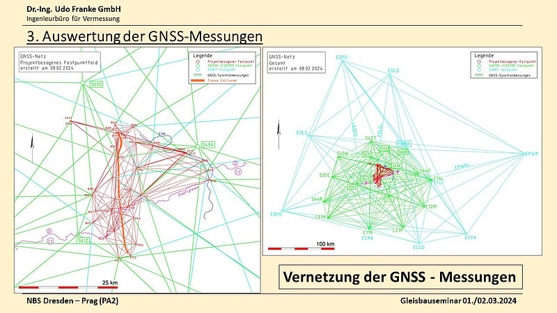 Im anschließenden Vortrag stellten Tilman Franke und Matthias Wolf (beide Dr.-Ing. Udo Franke GmbH, Ingenieurbüro für Vermessung, Radebeul) die Herausforderungen bei der Anlage, Messung und Auswertung des grenzüberschreitenden Festpunktfelds (Grundlagennetz) vor. Die fachliche Unterstützung sowie Auswertung und Bewertung der Ergebnisse erfolgte durch Prof. Dr.-Ing. habil. Lambert Wanninger (Technische Universität Dresden). Das dargestellte Festpunktfeld betrifft den grenzüberschreitenden Planungsabschnitt 2. Zielstellung war neben dem „Einhüllen“ der Trassenvarianten vor allem das Berücksichtigen von Portalbereichen, sowie den Portalen für die Zwischenangriffe. Hinzu kamen Forderungen zur Langlebigkeit des Netzes, damit die geodätischen Grundlagen auch noch zum Baubeginn verfügbar sind. Somit musste anfangs eine Vielzahl von praktischen Fragen geklärt werden. Ein wichtiger Punkt war z. B. die korrekte Höhenbestimmung und der Anschluss an das DB_REF2016. Das projektbezogene Grundnetz umfasst 23 Punkte (mittlerer Abstand 6 km), hinzu kommen die Punkte zum Anschluss an übergeordnete Referenzsysteme. Die Erkundung war sehr zeitintensiv. Umfangreiche Betrachtungen waren für das Höhennetz durchzuführen Das betraf beispielsweise die Transformationsparameter zwischen den nationalen Höhenbezugsystemen. Im Ergebnis liegen die projektbezogenen Festpunkte mit einer Lagegenauigkeit von < 3 mm und einer Höhengenauigkeit von < 5 mm vor! Damit wurde eine beeindruckend präzise Grundlage für die weiteren geodätischen Arbeiten an der NBS Dresden - Prag geschaffen (Abb. 5).