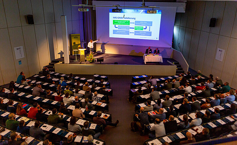 Den Auftakt bildete der Vortrag „Kombination von Inertialmesstechnik und GNSS für Gleisbauarbeiten ohne vorhandenes Festpunktfeld“ von Kai Naumann, vorgetragen durch Andreas Sinning (beide Trimble Railway GmbH). Zur Anwendung kam bei diesem Projekt in der Türkei das Trimble GEDO IMS-GNSS-System. Eingangs wurde die verwendete Messtechnik erläutert, wobei auf Möglichkeiten und Grenzen eingegangen wurde. Einfluss auf die erfasste Trajektorie haben vor allem die Sensordrift und Vibrationen. Um die hohen geodätischen Anforderungen an die Aufnahme von Gleisen zu erfüllen, ist die Verwendung von IMUs mit faseroptischem Kreisel (FOG) erforderlich. Im Weiteren folgte die Erläuterung der Anforderungen an die Inertialmesstechnik. Hierbei ging es um den Messungsablauf zur Ableitung einer absoluten Gleisgeometrie ohne Festpunktfeld. Wenn weder Festpunkte noch Sollgeometrie vorliegen, kann mit einer Gleisbaumaschine nur eine relative Lage des Gleises hergestellt werden. Mit Inertialmesstechnik und GNSS hingegen ist es möglich, eine absolute (neue) Gleislage zu ermitteln. Eine herkömmliche Vermessung ist dann nicht (mehr) erforderlich. Nach der Bearbeitung der aufgenommenen Trajektorie wird eine neue, optimale Gleisachse ermittelt und daraus die sog. Stopfdatei erzeugt. Diese Technologie konnte bei einem Testprojekt für die TCDD in der Türkei erfolgreich mit zwei Messverfahren (GEDO IMS-TS und GEDO IMS-GNSS) angewandt werden. Dazu wurde eine neugebaute Teststrecke genutzt, die zu Prüfzwecken zusätzlich Festpunkten aufwies. Die Ergebnisse zeigen, dass die mit verschiedenen Verfahren ermittelten Trajektorien nur geringfügig voneinander abweichen. Es ist eine signifikante Steigerung der Produktivität für vorhandene Gleistrassen zur Herstellung eines absoluten Bezugs zu verzeichnen. Probleme gibt es noch bei der Ableitung der Höhenlage. Es gilt aber bereits jetzt als erwiesen, dass die Erfassung der Gleislage mit GNSS den Anforderungen genügt.