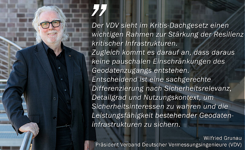 Wilfried Grunau, Präsident des VDV, erklärt dazu: „Der VDV sieht im Kritis-Dachgesetz einen wichtigen Rahmen zur Stärkung der Resilienz kritischer Infrastrukturen. Zugleich kommt es darauf an, dass daraus keine pauschalen Einschränkungen des Geodatenzugangs entstehen. Entscheidend ist eine sachgerechte Differenzierung nach Sicherheitsrelevanz, Detailgrad und Nutzungskontext, um Sicherheitsinteressen zu wahren und zugleich die Leistungsfähigkeit bestehender Geodateninfrastrukturen zu sichern.“