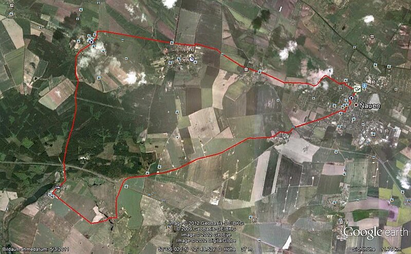 Die 28 km lange, geführte Tour, die auch für weniger geübte Radfahrer geeignet war, begann um 10 Uhr am Bahnhof Nauen und ging mit ein paar Erläuterungen an den Zwischenstationen über Neukammer, Quermathen und Groß Behnitz nach Ribbeck, wo am Birnbaum neben Kirche und Schloss eine Rast eingelegt wurde, bevor es über den Havelland-Radweg wieder zurück nach Nauen ging.
