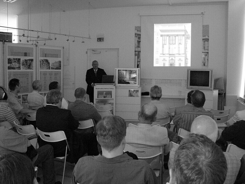 In einer gut besuchten Informationsveranstaltung referierte am 27. Mai 2009 Herr Gunther Kämmerer, Leiter des Informationszentrums am Hausvogteiplatz in Berlin-Mitte, über die Geschichte, Bedeutung und die architektonische Schönheit dieses ehemaligen Schlosses. Wichtiger Teil des Referats war der vom Bundestag initiierte Wettbewerb, aus dem Ende 2008 der italienische Architekt Prof. Franco Stella mit seinem Entwurf als 1. Preisträger hervor ging. Damit wird das zentrale Bauwerk der Stadt Berlin wieder erstehen. Die historische Kuppel wird zurückkehren. Der Entwurf berücksichtigt den Wiederaufbau von drei Außenfassaden, aber auch eine moderne Ostfassade zur Spree hin sowie eine schlichte, moderne Westfassade im Schlüterhof. Im Inneren wird es ein moderner Bau werden, der es dennoch kommenden Generationen ermöglichen könnte, auch bedeutende Raumfluchten des alten Schlosses zu rekonstruieren. Bis zum Herbst 2009 wird die Entwurfsplanung überarbeitet und zur Ausführungsplanung weitergeführt. Dabei spielt die Kostenobergrenze des Bundestags von 552 Millionen Euro eine wichtige Rolle. Bauherr ist das Bundesamt für Bauwesen und Raumordnung.
