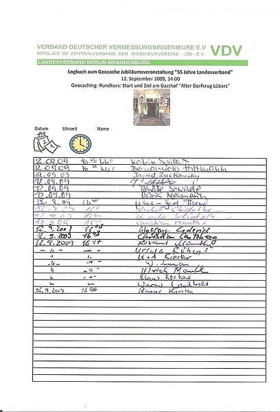 Zum 55-jährigen VDV-Jubiläum in Berlin wurde am 12. September 2009 unter dem Motto „Umsonst und Draußen" gefeiert. Das Angerdorf Lübars im Norden Berlins mit seinen Feldern und Wiesen und dem ursprünglich gebliebenen Dorfanger war Inspiration genug, einmal ein etwas anderes Fest zu wagen. Begonnen wurde mit einem Geocaching, einer modernen Art der Schnitzeljagd. Wanderschuhe waren hier für die zahlreichen Teilnehmer von Vorteil, denn es ging durch Feld und Flur. Auch für erfahrene Berufskollegen war diese Art der Anwendung des GPS-Dienstes eine neue Erfahrung, die im Freizeitbereich immer populärer wird und somit auch schon einen eigenen Wirtschaftszweig entstehen ließ. Erfahrene Geocacher haben hierbei schon erstaunliche Fähigkeiten im Umgang mit den verschiedensten Koordinatensystemen entwickelt.