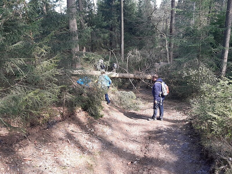 Um dem geplanten Wanderweg folgen zu können mussten nun so einige umgestürzte Bäume überwunden werden. Zur Orientierung wurde das ein oder andere Mal auch das Smartphone mit seinen Tools zur Hilfe genommen. Es ging so einige Male bergauf und bergab bis der „Wanderparkplatz am Rosengarten“ passiert werden konnte.