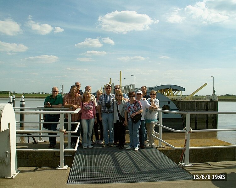 August: Fahrt mit der Sonderfähre „Bingerbrück“ bei Brohl-Lützing, die zu einem Peilschiff umgebaut wurde. Herr Dipl.-Ing. Mierswa von der WSD (Wasser- und Schiffahrtsdirektion) Südwest erklärte uns die Aufnahme von „Sohlteppichen“ mit einem Mehrfachschwingersystem (Flächenecholot).