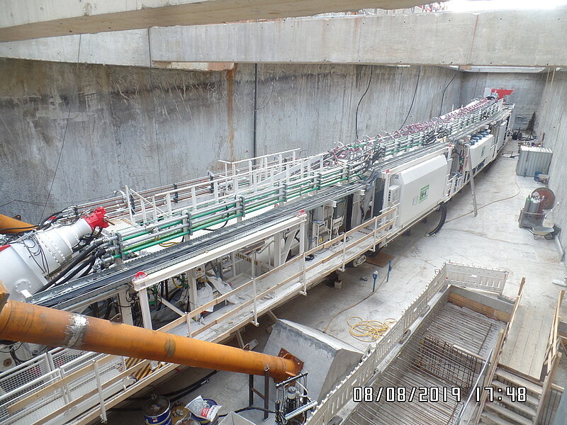 Bei unserem Besuch wurden wir zunächst von Mitarbeitern der ausführenden Baufirmen herzlich empfangen. Im Baubüro wurde uns zunächst das Bauprojekt im Allgemeinen vorgestellt und dann über den aktuellen Baufortschritt informiert. Danach ging es mit entsprechender Schutzkleidung ausgestattet über die Baustelle mit all ihren Einrichtungen und Gerätschaften (unter anderem eine Rettungskammer) zur 18 Meter tiefen Startbaugrube, in der die Tunnelvortriebsmaschine montiert wird. Zum Zeitpunkt unseres Besuches war die Endmontage fast abgeschlossen, so dass wir die Maschine nahezu komplett ausgiebig in Augenschein nehmen konnten. In diesem Zusammenhang war interessant zu erfahren, dass zwei Mitarbeiter der Herstellerfirma die Maschine ohne Montageplan also sozusagen "aus dem Kopf heraus" zusammenbauen.