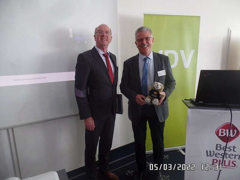 Der VDV Präsident Grunau freut sich darüber, dass er nach 2 Jahren wieder ein Grußwort in Präsenz an die Teilnehmer richten kann. Er hat als Präsident des ZBI auch die Koalitionsverhandlungen begleitet und die Bildung des neuen Bauministeriums sehr begrüßt. Er geht auf den neuen Verlag für das VDVmagazin ein und das damit verbundene neue Layout. Weiterhin erwähnt er die bevorstehende Verleihung des Bundesverdienstkreuzes an Horst Helmig. Er überreicht Helmig ein historisches Buch über die Landesvermessung in Preußen von 1884 als Dankeschön für die langjährige ehrenamtliche VDV Verbandsarbeit.