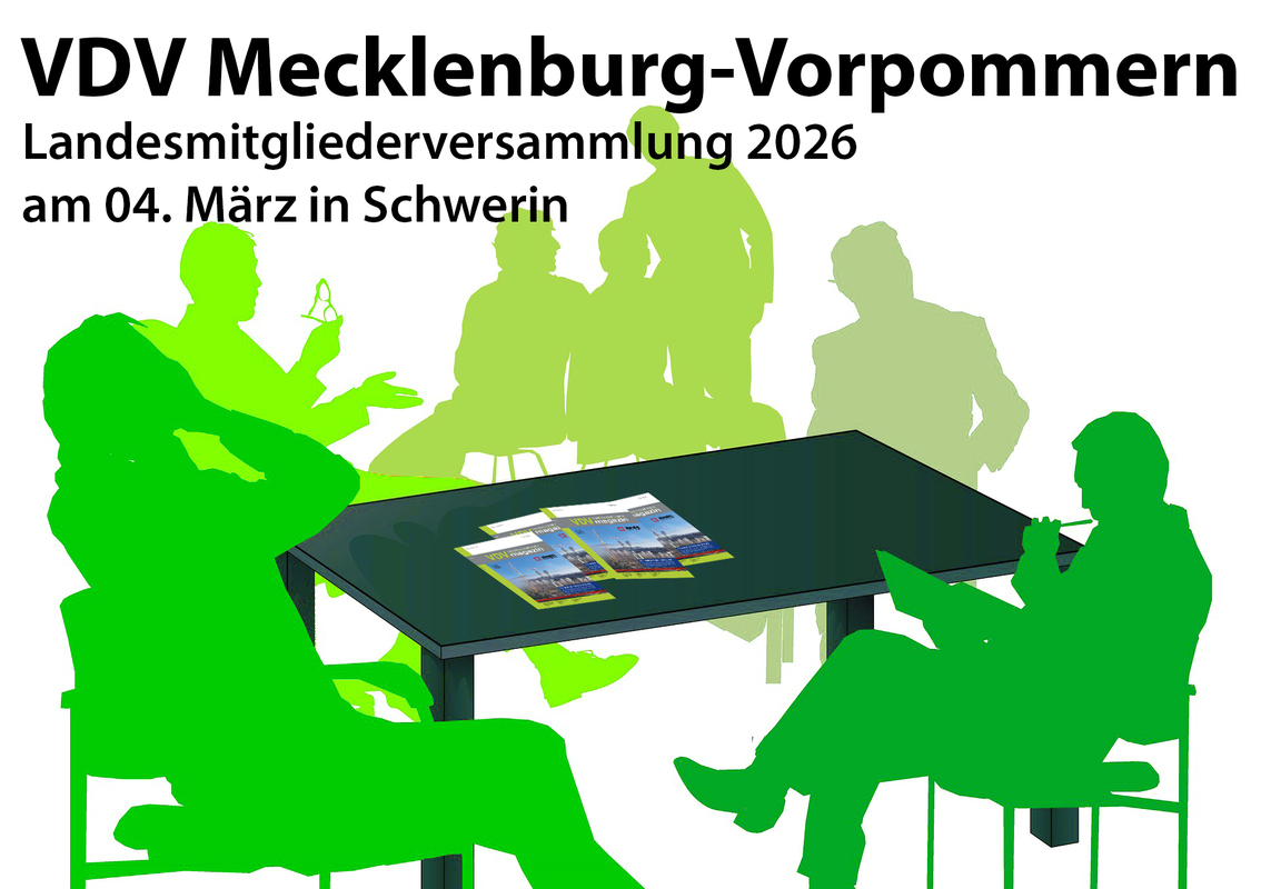 Der VDV Landesvorstand Mecklenburg-Vorpommern lädt Sie herzlich am 4. März 2026 um 16:30 Uhr zur Landesmitgliederversammlung in das Hotel Speicher am Ziegelsee, Speicherstrasse 11 in Schwerin ein.