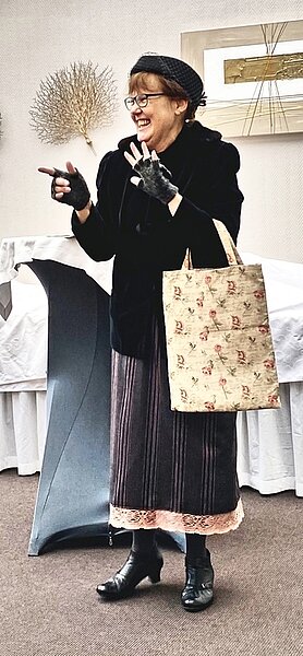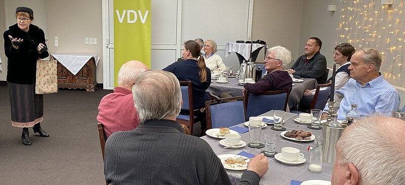 Der gemütliche Teil wurde nun bei Kaffee und Kuchen von einer Überraschung unterbrochen. Elisabeth Schleier, uns ja nicht unbekannt, kam als „Et Verzällscher“ in den Saal. Ihr Dialektvortrag war zwar für einige von uns nicht in allen Aussagen zu verstehen (es war ja im Bonner Dialekt), aber es war eine schöne Überraschung, die Ulrich Rosen vorbereitet hatte, sie lockerte den Nachmittag gelungen auf.