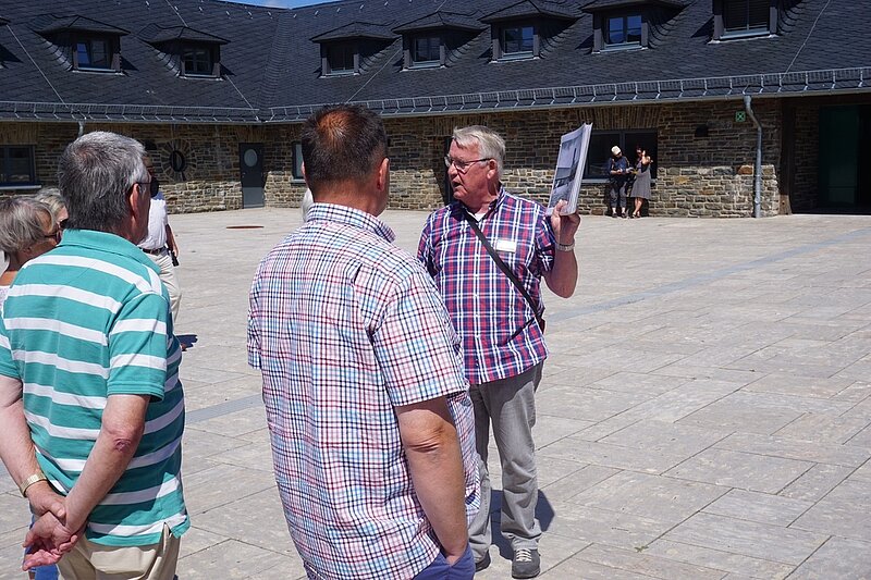Unter Leitung des Referenten Dirk Küsters verbrachten wir einen eindrucksvollen Vormittag, der mit dem Besuch der Dauerausstellung „BESTIMMUNG: HERRENMENSCH NS-ORDENSBURGEN ZWISCHEN FASZINATION UND VERBRECHEN“ in Forum Vogelsang IP begann. Die Dauerausstellung der NS-Dokumentation Vogelsang zeigt die Hintergründe und Ziele rund um den Bau und den Betrieb der Ordensburg. Herr Küsters vermittelte uns bei unserem Rundgang über das Areal die menschenverachtende Ideologie und Überheblichkeit des Nationalsozialismus, die der Planung und dem Bau der Ordensburg zugrunde lag. An Hand von Originalaufnahmen verdeutlichte unser Referent die Ausmaße und den Größenwahn der ursprünglichen Anlage, die sich nur noch erahnen lassen. Wie die meisten Großbauten der NS-Zeit ist sie nie fertiggestellt worden. Die unter Denkmalschutz stehenden Bauwerke umfassen eine Bruttogeschossfläche von mehr als 50.000 m2 und gelten damit nach den Parteitagsgebäuden in Nürnberg (100 ha) als größte bauliche Hinterlassenschaft des Nationalsozialismus. Viele Bauten wurden von den Nachnutzern erhalten. Aber auch die aus Kriegsschäden resultierende Lücken sind zu erkennen.