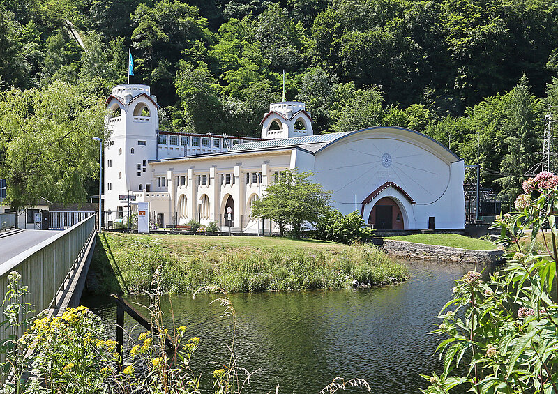 Das Wasserkraftwerk Heimbach, gebaut 1905 im Jugendstil, wird über einen fast drei Kilometer langen Stollen aus der Urfttalsperre versorgt. Ein Höhenunterschied von 110 m den das Wasser durch den Stollen rauscht, ist ideal zum Antrieb der Turbinen.