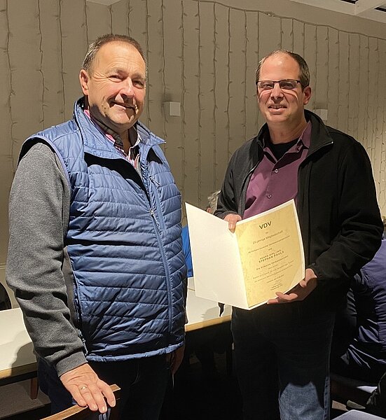 Wenn der Stammtisch auf den Nikolausabend fällt, dann muss das auch passend gewürdigt werden. Aber zuerst stand eine Ehrung für Stephan Pauls für seine 25jährige Mitgliedschaft an. Ulrich Rosen, noch in neutraler Ausstrahlung, ehrte ihn mit Urkunde und Nadel.