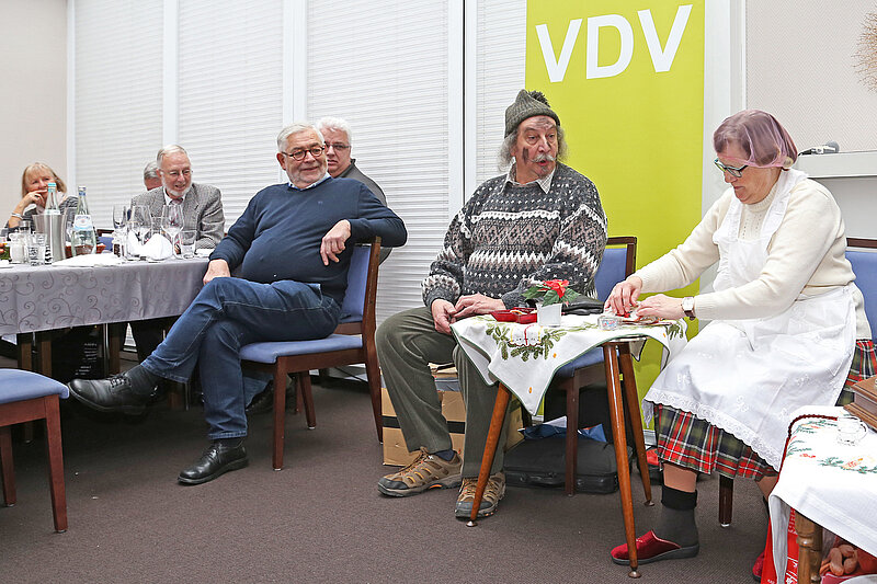 In besonderer Verbundenheit zum VDV-Bezirk Bonn seit Mitte der 70-er Jahre, hier hatte er an vielen VDV-Reisen teilgenommen, gratulierte Willibald Dores aus Worms zum Jubiläum: „Ein Gesicht bekam der VDV für mich erst durch Euch, die VDV-Freunde hier im Bezirk Bonn“. Im Rahmenprogramm am Nachmittag begeisterten Elisabeth und Karl-Friedrich Schleier mit ihrem rheinischen Duett „Eine schöne Bescherung“. Manche, die dem rheinischen Dialekt nicht (mehr) ganz so sicher sind, mussten manchmal schon genauer hinhören, aber die Mimik der beiden Vortragenden war so eindeutig, dass alle den Spaß verstanden haben.