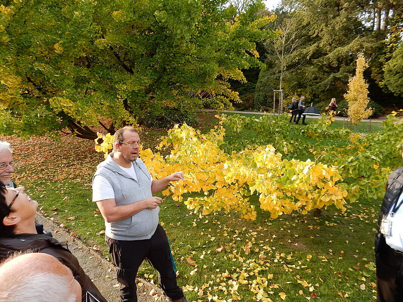 Bereits in den Jahren 1820 bis 1822 wurde im Auftrag der Adelsfamilie von Romberg auf deren Ländereien im heutigen Dortmunder Süden ein Landschaftsgarten nach englischem Vorbild hinter dem Schloss Brünninghausen angelegt. Das Schloss Brünninghausen wurde im zweiten Weltkrieg zerstört, übrig blieb nur das Torhaus. Gut 100 Jahre später, im Jahre 1927, erwarb die Stadt Hörde den Park und legte dort in den darauffolgenden Jahren einen Botanischen Garten an. Neben der bergbaulichen Vergangenheit, mit seinen rostroten Bächen der Schondelle zeichnet den Rombergpark das Arboretum aus. Die Arboreten sind weit über Dortmund hinaus in ganz Europa als bedeutende Baumsammlung bekannt. Hier wurde und wird wieder die Lebensfähigkeit von internationalen Bäumen in unserer sich verändernden Klimaentwicklung erforscht. So wurde vor wenigen Jahren eine große Menge an Eichen aus aller Welt mit den Bürgern gepflanzt, um die Eichenart zu finden, die in unserem Klima am besten gedeiht. In der vierstündigen Führung haben wir neben vielen Anekdoten viel über die medizinische (eher berauschende) Wirkung diverser Pflanzen gelernt. Ausgerechnet der Ginko hat nach Aussage von Dr. Knopf sehr wenig medizinisches Potential, zieht aber mit vielen Präparaten den Menschen Geld aus der Tasche. In der Kaffeepause am schulbiologischen Zentrum wurden alle botanischen Fragen beantwortet. Durch die vielen Fragen und das enorme Wissen wurde leider nur ein Viertel des 65 ha großen Parks erkundet. Das heißt, der Bezirk kommt wieder. Dr. Knopf muss also noch mal ran. Evtl. dann aber zu einer anderen Jahreszeit.