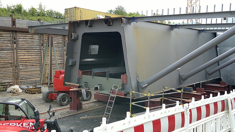 Der Überbau der neuen Brücke besteht aus einem geschlossenen Stahlhohlkasten mit seitlich angeordneten Druckstreben. Die bis zu 160 t schweren, vorgefertigten Stahlteile werden per LKW angeliefert, im Taktkeller zusammengefügt, verschweißt, beschichtet und auf Teflonlagern von beiden Widerlagern aus Richtung Lenne, vorgeschoben. Als Gleithilfe kommt einfaches Spüli von ALDI zum Einsatz J. Der mittlere Teil der Brücke über die Lenne wird im Freivorbau errichtet.