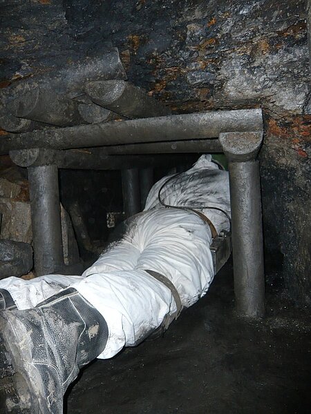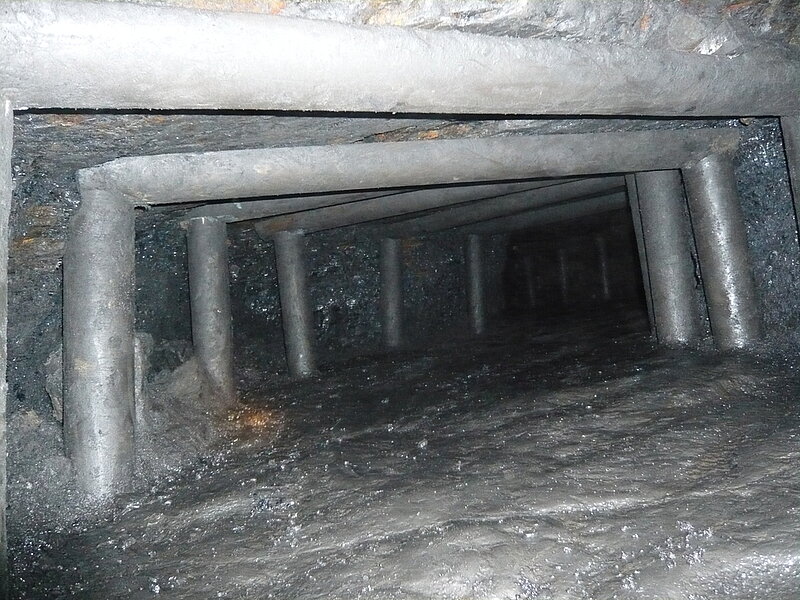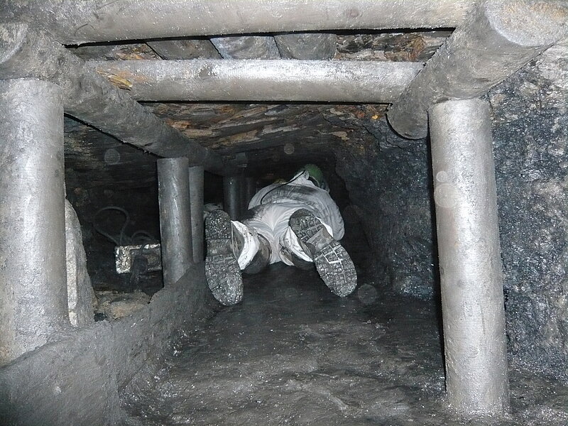 Die Kohlen wurden vermutlich in der damaligen Zeit mit einem Hunt auf einem Schlitten aus dem Bergwerk geschoben. Highlight war der Streb in Flöz Sengsbank mit noch vorhandener Lagerstätte. Die Fortbewegung klappte hier dann auch nicht mehr auf allen vieren, hier half nur noch kriechen. Vor Ort konnte jeder versuchen mit einer Hacke bei 55 cm Ausbauhöhe Kohle zu lösen. Dabei sollte nicht nur Staub und Kleinmaterial produziert werden, sondern brauchbare große Kohlenstücke. Allein im Liegen die Hacke in Kohle zu bekommen ist schon schwierig. Es ist schon beeindruckend unter welchen schwierigen Bedingungen die damaligen Bergleute vor Ort arbeiten mussten. Der Ausflug in das 19. Jahrhundert verging dank der kompetenten Führung wie im Flug. Die Befahrung wird der ein oder andere Kollege in den nachfolgenden Tagen mit ein wenig Muskelkater im Gedächtnis bleiben.
