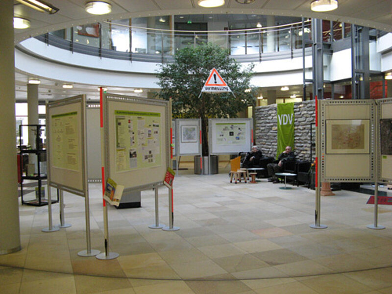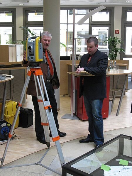 Als weiterer Höhepunkt des Abends wurde in der Sparkasse Paderborn, Geschäftsstelle „Schildern“, eine 14-tägige Ausstellung zum Thema „Vermessung in Paderborn“ eröffnet. Im Kassenraum der größten Zweigstelle der Sparkasse haben die Kollegen eine Reihe Stellwände mit Informationstafeln und Kartenwerken bestückt. Der Besucher erhält einen kompakten überblick über Produkte und Dienstleistungen der Vermessung, sowie über die verschiedenen Einsatzgebiete eines Vermessungsingenieurs oder Geoinformatikers. Zusätzlich werden Organisation, Aufbau und Ziele des VDV und auch die Aktivitäten des Bezirks Paderborn gezeigt. Abgerundet wird die Ausstellung durch eine Vielzahl von Exponaten in insgesamt sieben Vitrinen, die sich mit historischen Instrumenten, Arbeitsmitteln aus den vergangenen Jahrzehnten und Fachliteratur beschäftigen. Während des Abends wurden durch den Kollegen Matthias Rötter Messgeräte der neuesten Generation vorgeführt und den interessierten Kollegen erläutert.