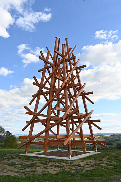 Unsere kleine Wandergruppe startete am Nachmittag am Wanderparkplatz nahe des neu errichteten Pavillons am Lohse-Uhlig-Steig, der als Interventionsfläche der Kulturhauptstadt Chemnitz 2025 ausgewiesen ist. Bei strahlendem Frühlingswetter führte der Weg durch einen Hohlweg im Wald, vorbei an „Mepps Ruh“ mit seiner geschnitzten Skulptur, hinauf zum Spitzberg. Dort erwartete uns nicht nur ein atemberaubender Ausblick, sondern auch eine kleine Stärkung, die Wanderleiter Detlef Wuttke zuvor im Wald deponiert hatte. Begleitet von Gesprächen unter Berufskollegen und Erläuterungen zur lokalen Geschichte sowie aktuellen Themen wie geplanten Windkraftanlagen, ging es weiter durch Wiesen, Felder und Waldlandschaften. Auf der Dittersdorfer Höhe (ca. 550 m ü. NN) eröffnete sich uns ein grandioser Rundblick über die Stadt Chemnitz bis zum Erzgebirgskamm. Dort begegneten wir zwei besonderen Zeugen von Raum und Zeit: der historischen Triangulationssäule von 1869 – Teil der Königlichen Sächsischen Triangulation – und einer 14 m hohen Holzskulptur mit dem Titel „Zwei in einander Gewobene“ des Dresdner Künstlers Olaf Holzapfel. Diese eindrucksvolle Arbeit ist Teil des Purple Path, einem Kunstpfad mit über 70 Stationen, der die Region als Kulturraum neu erfahrbar macht. Die moderne Skulptur in direkter Nachbarschaft zum historischen Vermessungsstein stellte für uns Vermessungsingenieure einen symbolträchtigen Moment dar. Als unser Besuch gegen 18 Uhr sein Ende fand, setzte wie aus dem Nichts ein Glockengeläut aus allen Richtungen ein – Auftakt der Aktion „Europe rings for Peace“, bei der europaweit Glocken für den Frieden erklangen.