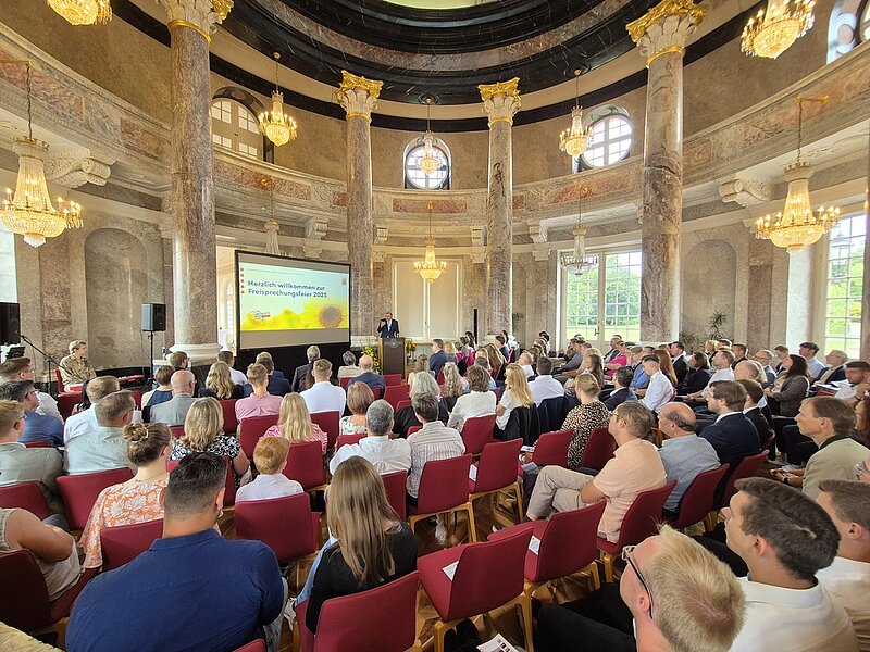 Insgesamt 45 Auszubildende aus den Ausbildungsberufen Geomatik und Vermessungstechnik haben mit der Sommerprüfung 2025 ihre Berufsausbildung erfolgreich bestanden und bekamen am 25. Juli 2025 im Rahmen der Freisprechungsfeier im Schloss Biebrich der Landeshauptstadt Wiesbaden ihre Zeugnisse ausgehändigt.