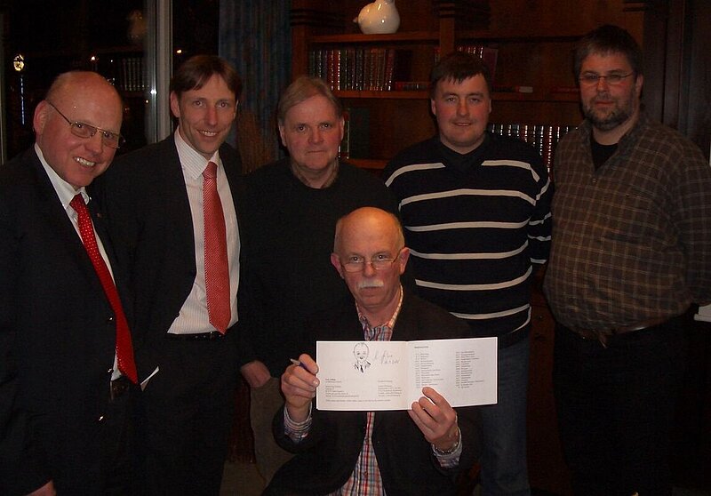 Zum Jubiläum, das am Dienstag, 16.03.2010 mit einer Feierstunde im Restaurant „Zum Kattenturm“ begangen wurde, konnte der Bochumer Professor Dr.-Ing. Hans Fröhlich gewonnen werden, der einen Vortrag zum Thema „Landesvermessung auf dem Bierdeckel“ hielt. Ihm gelang es in einem heiteren Spagat zwischen fachlichen und sehr unterhaltsamen Informationen die Verbindung zwischen den untrennbaren Bereichen Vermessung und Bier aufzuzeigen. Auf einer Vielzahl von Bierdeckeln sind demnach so genannte Trigonometrische Punkte (TP) abgebildet. Sie finden sich häufig an Kirchtürmen und dienen als Grundlage für alle Vermessungstätigkeiten. Fröhlich übersetzt dagegen TP auch gelegentlich mit „Trink Pils“. Begeistert nahm der gebürtiger Sauerländer, der in Warstein zur Schule ging und gerne in die „alte Heimat“ kam, denn auch eine Kostprobe „Soester Hell“ und „Soester Dunkel“ entgegen. Mit verschmitztem Lächeln kommentierte er, dass auf dem Bierdeckel anstatt einer Zwiebel doch lieber ein TP zu sehen sein sollte.