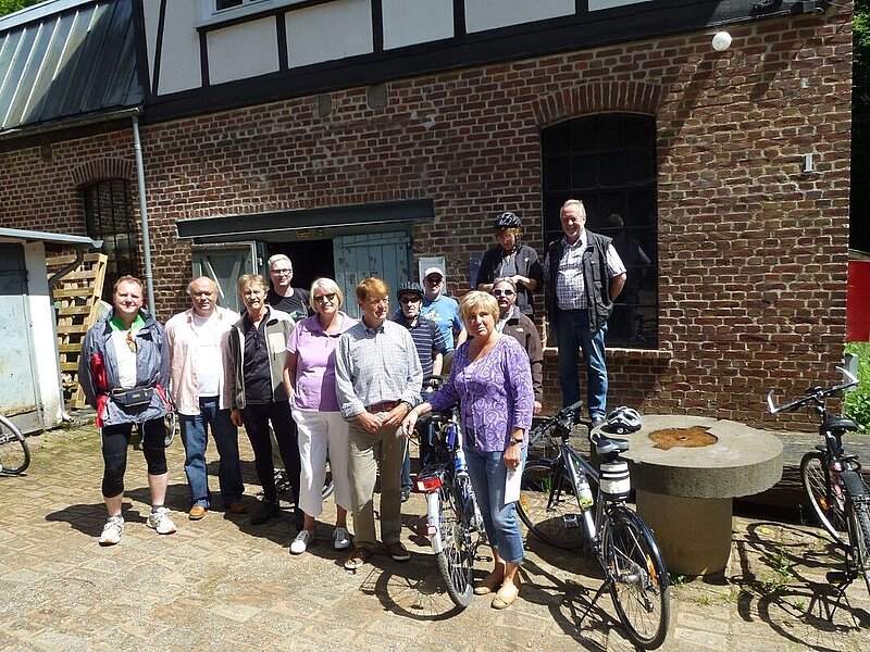 Von Cronenberg ging es abwärts (7%) bis zum Manuelskotten im Kaltenbacher Tal. Der Kotten ist der letzte mit einem Wasserrad betriebene Schleifkotten in Wuppertal. Hier wurde uns bei einer Führung das Arbeiten der ehemals bis zu 28 Mann starken Belegschaft der Nass- und Tockenschleifstelle demonstriert. Früher waren die meisten der hier tätigen Schleifer selbstständig. Noch heute werden hier von einem Schleifer Cuttermesser im Auftrag eines Remscheider Unternehmens zu Ende gefertigt. Die verschiedenen Antriebsarten der Schleifsteine und Polierscheiben - Wasserrad, Dampfmaschine, Dieselmotor und Elektromotor - wurden uns von Herrn Hummel vom Förderverein Manuelskotten eindrucksvoll vorgeführt. Im Clubraum in der ersten Etage des Kotten konnten wir zum Schluss die einzelnen Erzeugnisse der Wuppertaler Werkzeugindustrie bestaunen.