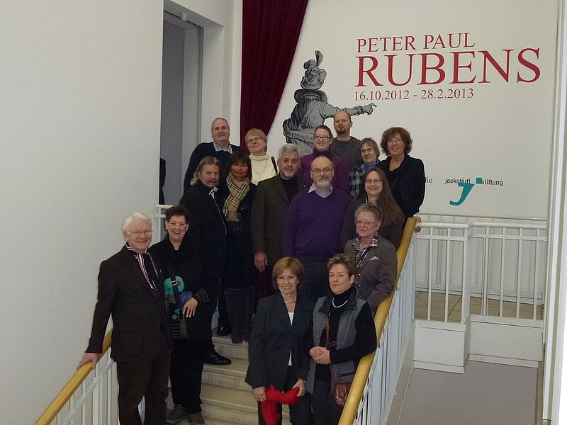 Nach der erläuternden Führung hatten wir noch die Möglichkeit, den Museumsfilm zur Rubens-Ausstellung uns anzuschauen. Gerhard Finckh, seit 2006 Direktor des Von der Heydt-Museums, wandelt zu jeder Sonderausstellung auf den Spuren der Künstler. So wurde in einem 20 minütigen Film das Leben von Peter Paul Rubens vor Ort illustriert. Finckh ging von Siegen (Geburtsort) nach Antwerpen, wo Rubens nur durch seine lange Italienreise (1600-1608) und den diplomatischen Tätigkeiten bis zu seinem Tod (1640) lebte. In Antwerpen stellte uns Gerhard Finckh virtuell das Wohnhaus von Rubens mit seiner „Meisterwerkstatt“, die Liebfrauenkathedrale mit den berühmten Altargemälden, das „Koninlijk Museum voor Schone Kunsten“ mit der großen Rubenssammlung und die St. Pauluskirche mit der Gemäldereihe „Die 15 Geheimnisse des Rosenkranzes“ vor.