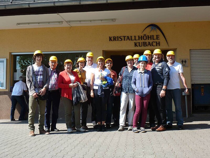 Vor der Führung in der Kristallhöhle Kubach erläuterte uns Herr Mathes anhand des Grubenplans, welche Sondierungsbohrungen zur Erforschung des Höhlensystems bisher vorgenommen worden sind und welche in Planung stehen. Es wird vermutet, dass der Kalk-Stollen und die Kristallhöhle einen Zusammenschluss besitzen. Die Kristallhöhle wurde durch Zufall in den 70‘er Jahren entdeckt, weil man nach einer Tropfsteinhöhle suchte, die vorhanden ist, aber bis heute nicht neu entdeckt wurde, da keine Pläne vorhanden sind. Nach dieser Einweisung haben wir an einer Führung in der Kristallhöhle Kubach, der einzigen Kristallhöhle der Bundesrepublik teilgenommen. Die Kristallhöhle besitzt mit 30m Höhe auch die höchste Halle aller deutschen Schauhöhlen. Erstaunlich war das fast senkrecht verlaufende Einstiegsloch (ca. 60 cm Durchmesser) zu sehen, durch das der erste Mensch diese Höhle betrat. Wir hatten es etwas bequemer, wir mussten lediglich "nur" 456 Stufen bergab und auch wieder aufwärts steigen. Das anschließende Mittagessen auf der Terrasse des Höhlenhauses haben wir uns dadurch redlich verdient gehabt.