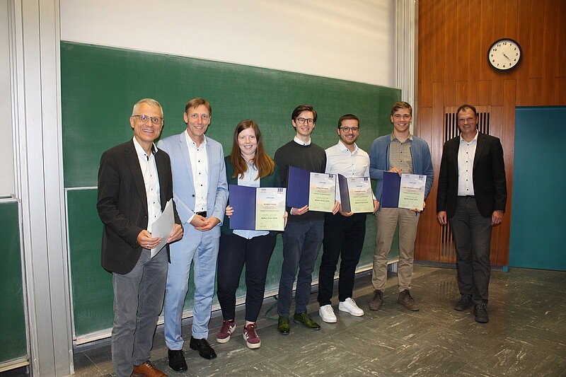 Am 5. Juni 2025 verliehen Andreas Wizesarsky (Vorsitzender des DVW NRW e.V.) und Ulf Meyer-Dietrich (Landesvorsitzender NRW des VDV) erstmalig an der Universität Bonn den "Besten-Preis". Wurden die besten Absolventinnen und Absolventen bisher nur vom DVW NRW e.V. ausgezeichnet, soll zukünftig ein gemeinsamer Preis der berufsständigen Vertretungen verliehen werden. Im Rahmen des Geodätischen Kolloquiums am Institut für Geodäsie und Geoinformation erhielten Raphael Deimel und Leon Alexander Schmidt die Auszeichnung für ihre herausragende Leistungen im Bachelor-Studiengang. Annika Tobies und Kilian Trimborn wurden für Ihren Master-Abschluss geehrt. Bereits vor dem Kolloquium kamen die Preisträger und die Vorsitzenden der Berufsverbände in der Bibliothek des Instituts zusammen und tauschen sich gemeinsam mit dem geschäftsführenden Direktor des Instituts, Prof. Dr. Heiner Kuhlmann, über das Studium und die weiteren Pläne aus. Dabei durfte auch schon auf den Preis angestoßen werden. Der DVW NRW e.V. und der VDV NRW wünschen allen Absolventinnen und Absolventen alles Gute für die Zukunft.