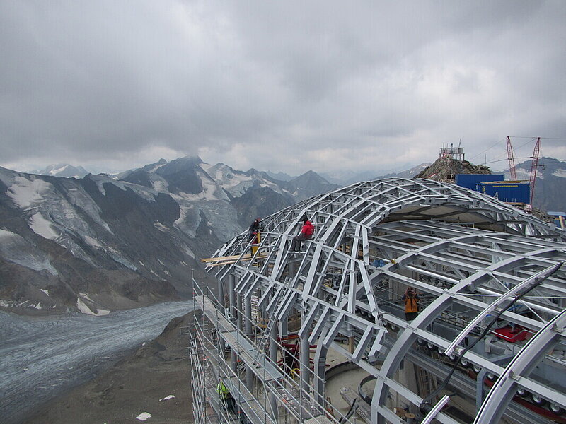 Innerhalb von 6 Monaten wurde auf 2.800 m eine neue Tal- und auf 3.440 m eine neue Bergstation für die Wildspitzbahn errichtet. Ein paar kleine Fakten dazu: Die tägliche Anfahrt zur Baustelle betrug je nach Wetter und Transportkapazität mit Lift, Pistenraupe oder ATV 1 - 2 Stunden. Schneeeinbrüche mit Minusgraden bis in den August hinein erschwerten die Arbeiten und die Baustelle war so klein, dass Container, Minibagger und anderes Baugerät nicht drumherum weggefahren werden konnten, sondern mit dem Kran umgesetzt werden mussten, wenn Sie im Weg standen.