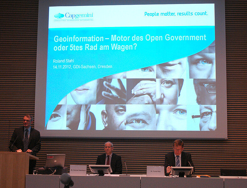 Im Impulsreferat zum Thema "Geoinformation - Motor des Open Government oder 5tes Rad am Wagen?" unterstrich Herr Stahl das enorme Potential eines strukturiertem Zusammenspiels von Geoinformationen in einer transparenten Verwaltung. Er hob hervor, dass sich der einfache Zugang zu öffentlichen Daten und offene Nutzungsbedingungen nicht nur in der Wirtschaft bezahlt machen.