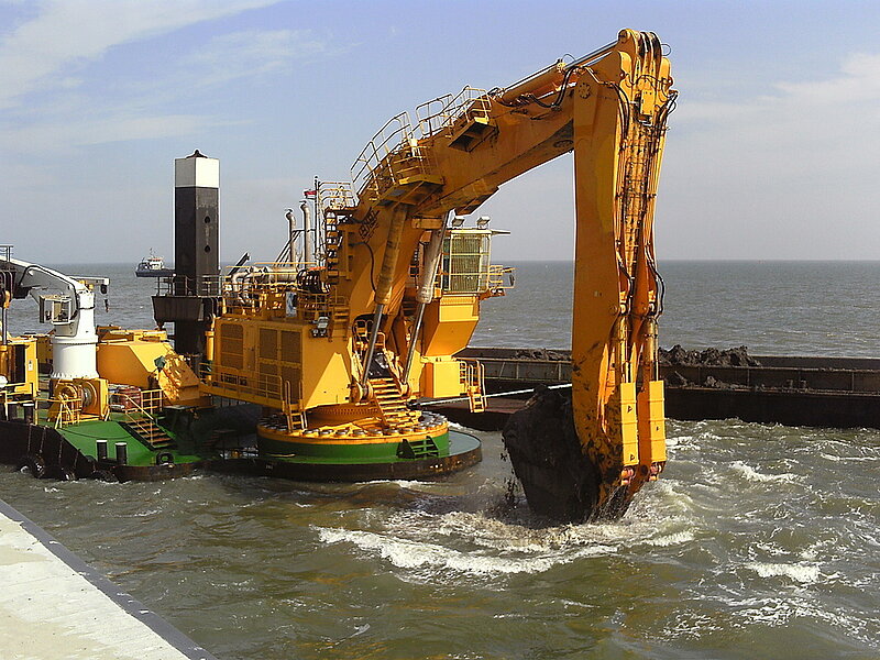 Highlight der Fahrt war der Rundgang im Bereich der Kaje, mit Erläuterungen zu den Genauigkeiten und Herausforderungen der vermessungstechnischen Arbeiten, sowie die Beobachtung eines Pontonbaggers bei den Wasserbauarbeiten.