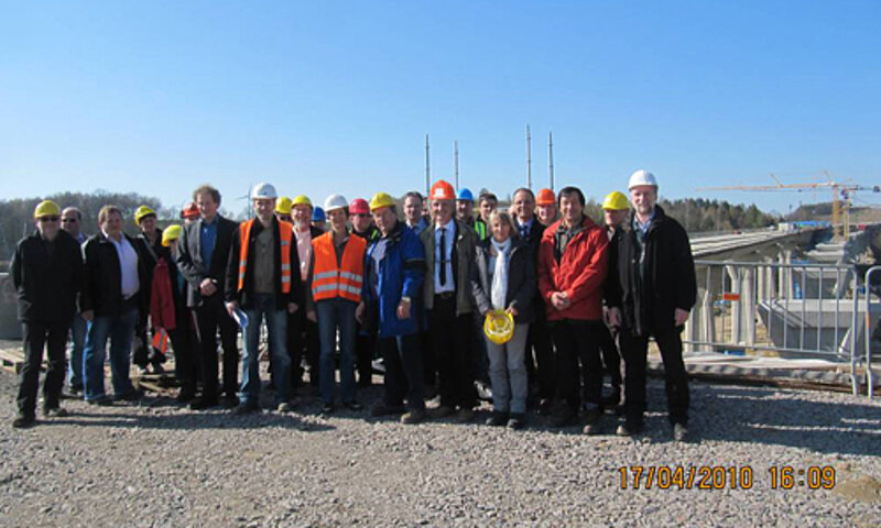 Die 710m lange Brücke wird mit zwei Verfahren hergestellt, zum einen im Taktschiebeverfahren und zum anderen mit einer „Vorschub-Rüstung“. Die Teilnehmer konnten wie geplant die letzten Arbeiten zum Lückenschluss über die Mulde besichtigen.