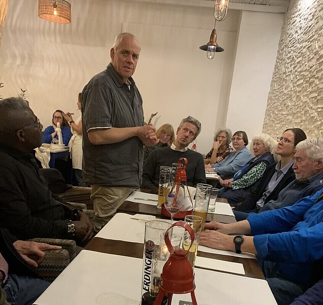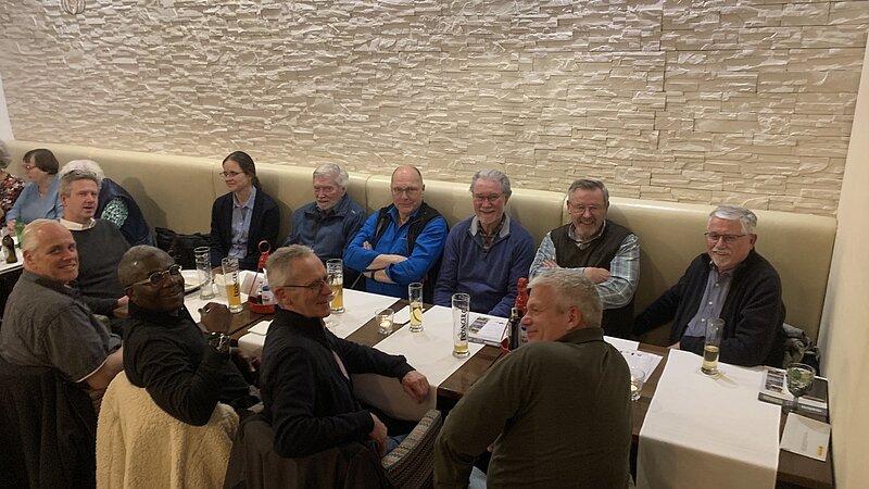 Eine erfreulich hohe Teilnehmerzahl bestätigte, dass die reale Welt im Bezirk Essen noch lebt. Die Tische mussten zusammengerückt werden und wer auf der langen Bank Platz genommen hatte, war zwar ein wenig in seiner Bewegungsfreiheit eingeschränkt, aber das störte nicht wirklich. Es entwickelten sich schnell intensive Gespräche, die den Raum auch akustisch füllten. Letztlich zeigte sich aber, dass unser langjähriger Treffpunkt im Haus Wilmes (wurde leider wegen eines Todesfalls geschlossen), nicht so einfach zu ersetzen ist. Alternativ-Vorschläge sind deshalb willkommen.
