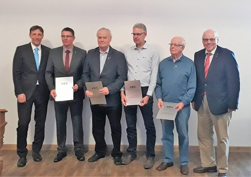 Als Referent sprach der Landesvorsitzende NRW Ulf Meyer-Dietrich über die Entwicklung des Vermessungswesens der letzten 50 Jahre. Der Ehrenlandesvorsitzender Klaus Meyer-Dietrich begrüßte in seiner Rede das Gründungsmitglied Heinz-Dieter Tilly. Winfried Czapp, Michael Buschmeyer sowie Günter Massong, weitere Gründungsmitglieder, konnten an der Jubiläumsveranstaltung leider nicht teilnehmen. Für seine 50-jährige Mitgliedschaft wurde Herbert Liefeldt geehrt. Ulrich Schäfers und Ralph-Gerald Siekmann-Böhm sind seit 25 Jahren Mitglied im VDV. Für 40-jährige Mitgliedschaft und davon 30 Jahre Kassenführung im Bezirk wurde Meinolf Schulte gedankt.