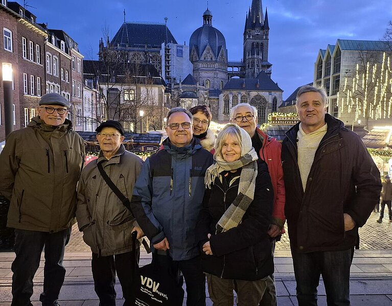 Am Mittwoch, 26.11.2025, machten sich 7 Bezirksmitglieder und Angehörige mit PKW und Deutscher Bahn auf den Weg nach Aachen. Zunächst deckten wir uns mit Einkäufen bei Kinkartz und Lindt für die anstehende Adventszeit ein. In der City schlenderten wir über die schön gestalteten Weihnachtsmärkte und labten uns an einem Kartoffelpuffer sowie an einem Glühweinstand.