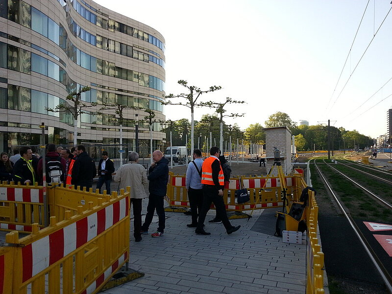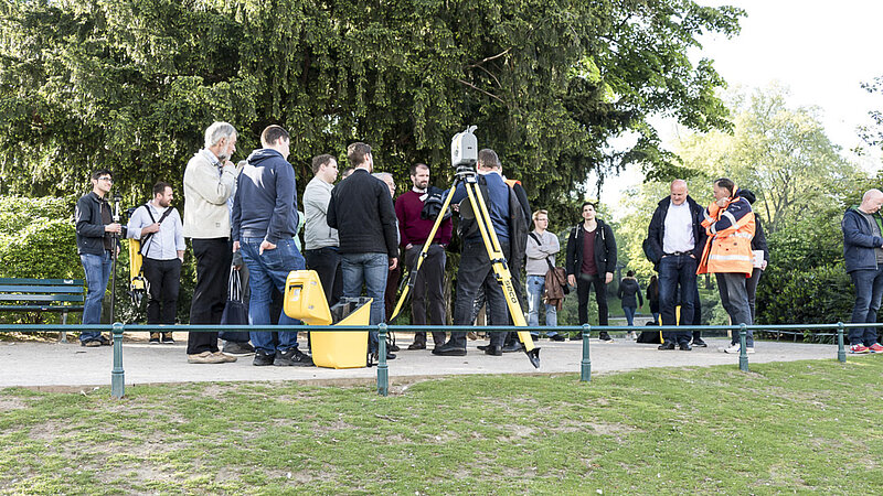 Die Mess-Objekte wurden bei Sonnenschein fußläufig in wenigen Minuten erreicht: Ein ‚Cut‘ in der Fassade und die Dachverbindung über der Piazza des Kö-Bogens (Architekt Daniel Libeskind), die ‚Goldene Brücke‘ zum Hofgarten mit ihren Jugendstilelementen und die Gleise an dem neuen Rheinbahn-Haltepunkt waren in ihrer komplexen Formenvielfalt zu erfassen. Durch zwei verfügbare Messausrüstungen konnten sich die Teilnehmer nach fachlichem Interesse aufteilen und zwischenzeitlich auch wieder die Station wechseln. Jeder wurde angeleitet, den Mess- und Auswertevorgang im Felde selbst auszuführen, z. B. auf dem Feld-Tablet-PC die exakte Detail-Anzielung der Totalstation mittels Zoom direkt im Mess-Bild ausführen.