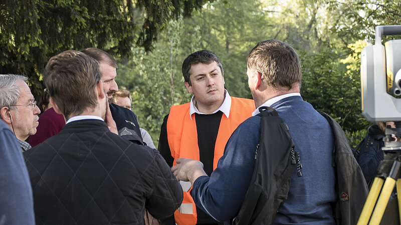 Bezirksvorsitzender Gerhard Vaupel begrüßte die Teilnehmer und beschrieb kurz einige Aspekte der Veranstaltung: ‚Unsere heutige Exkursion ist darauf angelegt, gerade auch Nachwuchs-Geodäten mehr Vermessungspraxis anzubieten. Wenn man auf die Neuordnung der Ausbildungsberufe mit den Lehrzielen Vermessungstechniker und Geomatiker blickt, sind wir alle Fachleute für Geoinformationstechnologie. In der Fachrichtung Vermessung folgt der technologischen Entwicklung ein neues Verständnis von Erhebung, Analyse, Auswertung von Daten. ‚Alltägliche‘ Vermessungsausrüstungen werden - innerhalb der üblichen Arbeitsabläufe - über Lösungen für herkömmliche Aufgaben bis hin zu komplexen 3D-Modellierungen verfügen‘.