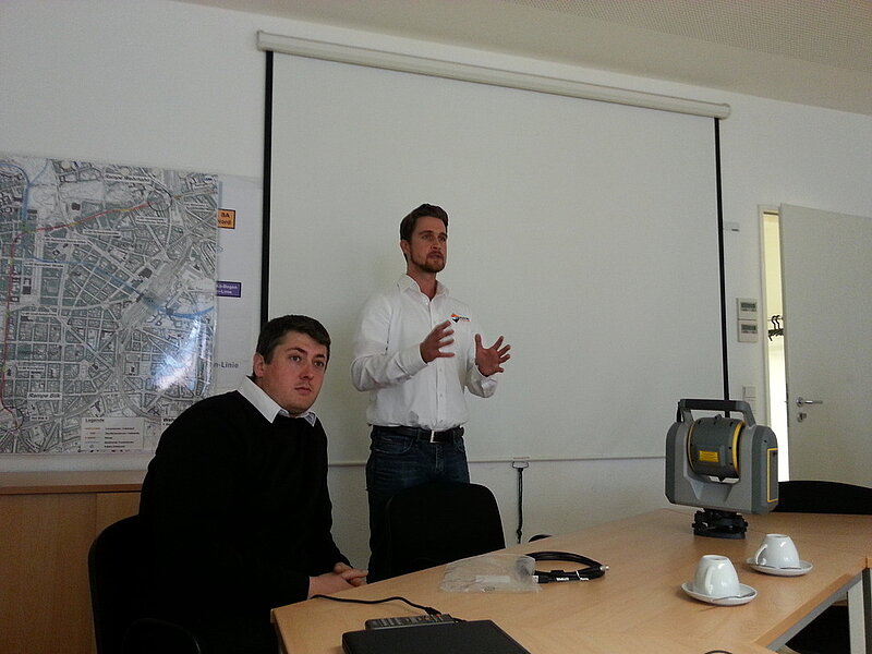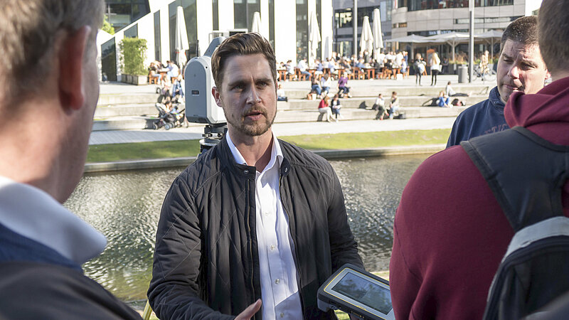 Als Vertreter dieser nächsten Generation vereint die TRIMBLE SX10 Scanning-Totalstation in sich das 3D-Scanning, eine Bilderfassungs- und Verarbeitungstechnologie und hochgenaue Totalstationsmessung (siehe auch Messebericht zur INTERGEO 2016, VDVmagazin 6/16, Seite 477). Damit der Messvorgang im Felde nachvollziehbar erlebt werden konnte, machten Vertriebsingenieur Sebastian Baum und Supporter Sascha Geisler von der Firma HERZOG Systemtechnik die Teilnehmer in einer kurzen Einweisung mit dem Instrument vertraut und fungierten danach als in allen Belangen sehr kompetente ‚Messtruppführer‘.