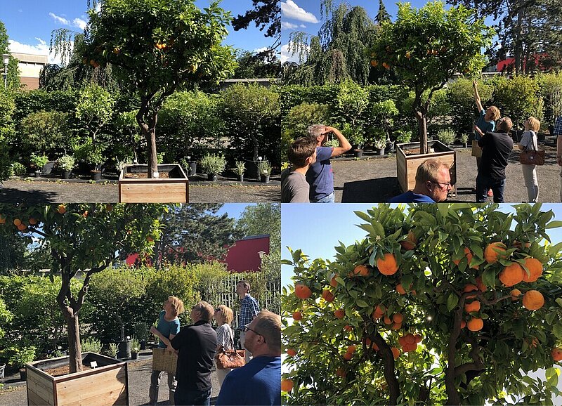 Das Rhein-Main-Gebiet ist klimatisch fast schon mit dem Mittelmeerraum vergleichbar, erklärte uns Frau Dr. Becker, sodass auch viele Pflanzen im Botanischen Garten im freien überwintern. Sollte es mal mehrtägigen Schneefall oder strengen Frost geben, dann werden die Pflanzen halt mit Stroh abgedeckt. Die Gewächshäuser waren leider schon geschlossen, auch die vielen Gärtnerinnen und Gärtner im Institut benötigen ihren Feierabend, aber das Freigelände bietet Einiges, seien es die verschiedensten Arten von Salbei, der Feldsalbei ist kein Exot, und dann war doch noch ein besonders prachtvolles Exemplar eines Orangenbaums.
