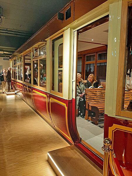 Der 5 t schwere "Kaiserwagen“ (Nr. 11 der Baureihe 1900) passte zentimetergenau in die neuen Ausstellungsräume und stellt den Kinoraum dar. Wir konnten nach dem Aufsetzen der VR-Brille und einer kurzen Einweisung eine virtuelle Fahrt mit der Schwebebahn über die 13,3 Kilometer lange Strecke erleben, wie sie vor fast hundert Jahren, zur Gründung der Großstadt Wuppertal am 01.08.1929 stattfand. Wuppertal war hier schon eine pulsierende Großstadt mit imposanten Gebäuden. Die Fahrt ging über trubelige Wochenmärkte, historische Fahrzeuge und vorbei an rauchenden Schornsteinen. Wir konnten in jede Richtung schauen, überall gab es etwas zu entdecken. Das damalige Wuppertal wurde komplett in 3D-Visualisierung nachgebaut - von den Gebäuden über die Menschen und Fahrzeuge bis hin zu den authentischen Laternen. Viele alte Bilder der Stadt Wuppertal wurden zur Weiterverarbeitung dem Archiv des Ressort 102 (Vermessung, Kataster und Geodaten) zur Weiterverarbeitung entnommen.