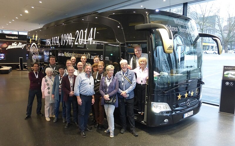 Ein jüngerer Guide mit hervorragenden Kenntnissen über den deutschen Fußball führte uns in 120 Minuten weit in die Tiefen des nationalen und des vereinsmäßigen Fußballgeschehens, zeitlich wie ein Fußballspiel in 2 Hälften mit Pause aufgeteilt. Der Einstieg gelang wunderbar mit den Helden von Bern, die 1954 mit einem 3:2 Sieg über Ungarn die Fußballweltmeisterschaft in der Schweiz gewannen. Es wurden die weiteren Fußballweltmeisterschaften gezeigt, ein Extra-Bereich gehört der WM 2014 als "Goldene Generation". In der gesamten Ausstellung staunten wir immer wieder über die originalen Exponate, die es zu bewundern galt. Auch die finanzielle Entwicklung des Massenphänomens "Fußball" ist enorm, wenn man erfährt, dass bei der WM 1954 die Prämien für ein Spiel bei 200,- DM lagen und als Siegprämien 1000,- DM gezahlt wurden. Dem deutschen Frauenfußball ist auch ein eigener Bereich gewidmet. Durch eine 3-D Kino-Show mit 7 amtierenden Weltmeistern, die durch besondere Hologramm-Technik das Gefühl des "Mittendrin" vermittelten, wurden wir in den Bereich des Vereinsfußballs weiter geleitet. Hier werden dem DFB-Pokal und dem Europapokal mit den dazugehörenden Siegpokalen einzelne Bereiche gewidmet. Die Geschichte des deutschen Fußballs wird in einzelnen Bundesliga-Dekaden aufgezeigt. Die Führung endet immer am Original Mannschaftsbus der Nationalmannschaft. Die Möglichkeit des Probesitzens wurde von allen gerne angenommen. Das "Deutsche Fußballmuseum“ ist mit einer Führung zu empfehlen, egal für welchen Lieblingsverein das Fußballherz schlägt. Sogar Handballfreunde waren unter uns, obwohl zeitgleich das erste Spiel der Handball WM in Kroatien der deutschen Nationalmannschaft gegen Montenegro (32:19) gezeigt wurde. Die Teilnahme an der Museumsführung wurde in keinster Weise als schlechter Ersatz angesehen.