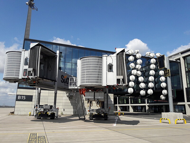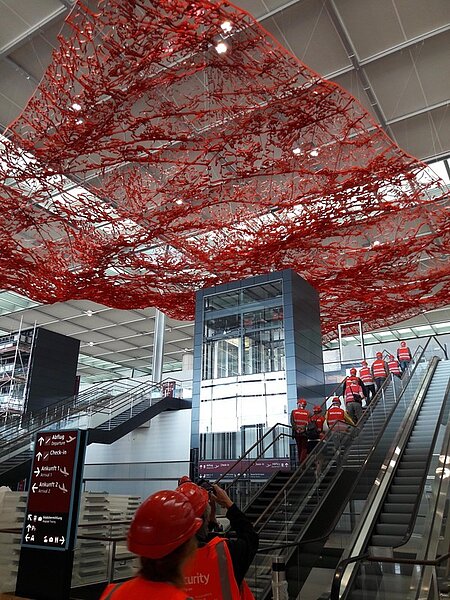 Verstärkt durch weitere Mitglieder wurde nach der Fahrradtour das Flughafengebäude besichtigt. Ausgestattet mit Warnwesten und Helmen zog eine muntere Truppe los. Einlass ins Gebäude war am künftigen Aufgang des unterirdischen Bahnhofs. Der fast fertige Schalterbereich wirkte etwas geisterhaft, ebenfalls mit Kunst ausgestattet, wird er von einem fliegenden Teppich-Netz überschattet. Weiter ging es über verschiedene Wartebereiche und die zukünftige Mall des Flughafens auf die Dachterrasse. Bei wunderschönem Sonnenschein gab es hier oben einen beeindruckenden Blick über das Vorfeld und den Tower, sowie den Blick auf die Berliner Skyline mit ihrem markanten Fernsehturm.