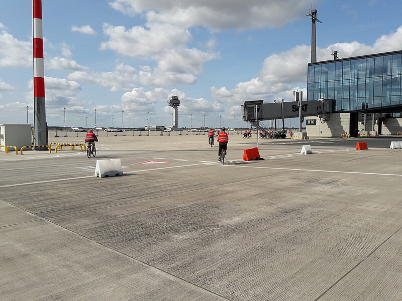 Das Vorprogramm startete gegen 13.30 Uhr mit einer geführten Fahrradtour über das Flughafengelände. Etwa 15 Teilnehmer fanden sich ein, um unter fachkundiger Leitung einer Flughafenmitarbeiterin das Flughafengelände zu erkunden. Zunächst ging es durch die Sicherheitskontrolle, danach befuhren die Teilnehmer das Vorfeld des Flughafens. Aus nächster Nähe wurde der künftige Stellplatz für den Airbus A380 besichtigt. Auch Kunst am Bau gab es dabei zu sehen, so hängt an einem der Flugsteige eine überdimensionale Perlenkette.
