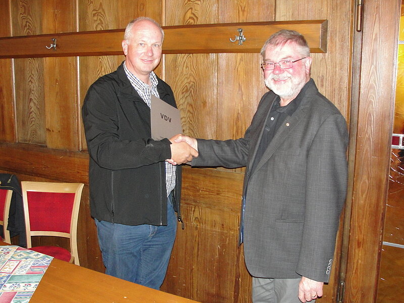 Ehrungen: Für 40 Jahre VDV-Mitgliedschaft wurde Alfred Schwarz die Ehrenurkunde und -nadel überreicht. Klaus Herden und Friedrich Fischer, ebenfalls seit 40 Jahren VDV-Mitglieder, konnten an der Veranstaltung nicht teilnehmen. Ihnen werden nachträglich die Ehrungsuntensilien beim nächsten Semestertreffen im Herbst überreicht Dank und Glückwünsche an die Geehrten!