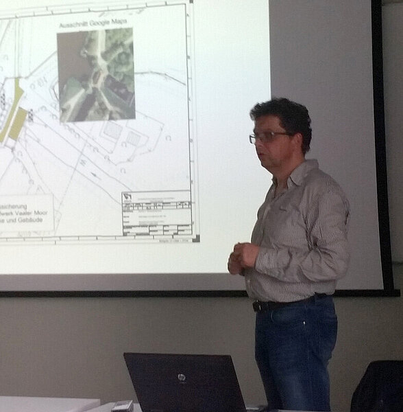 Den Auftakt bildete ein Vortrag von Dipl.-Ing. Thomas Czerwonka von der Wasser- und Schifffahrtsverwaltung. Jedem ist bekannt, dass die Schleusenanlagen Brunsbüttel des Nord-Ostsee-Kanals um eine weitere Schleusenkammer, der fünften, erweitert werden sollen. Dipl. Ing Czerwonka stellte den interessierten Zuhörern anschaulich dar, welcher Aufwand zur Beweissicherung beim Bau dieser 5. Schleusenkammer getrieben werden muss. Anhand diverser Pläne und Planzeichnungen erhielten die Zuhörer einen Einblick in die vorgenommenen vermessungstechnischen Arbeiten und nebenbei auch noch allgemeine Information zu den Schleusen.
