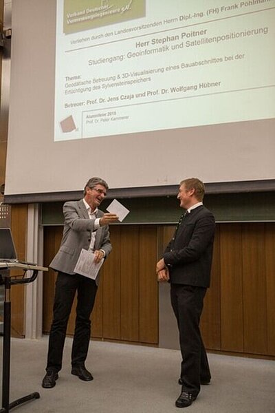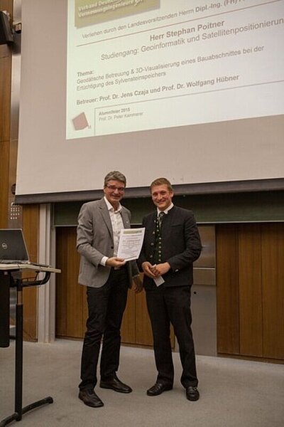 Auch dieses Jahr konnte im Studiengang Geoinformatik und Satellitenpositionierung eine herausragende Bachelorarbeit vom Landesvorsitzenden Frank Pöhlmann ausgezeichnet und mit einem Geldbetrag prämiert werden.