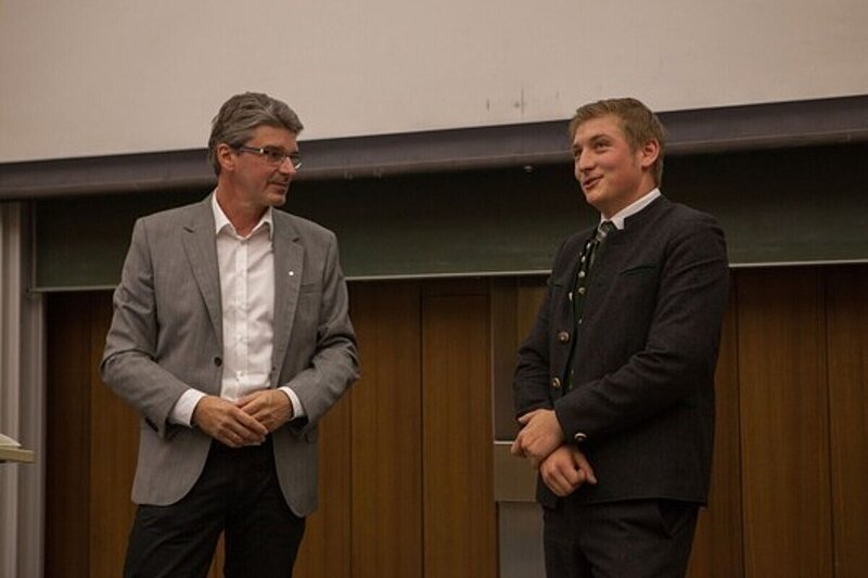 Am Ende der Prämierung durfte der Absolvent den zahlreichen Zuhörern des vollbesetzten Audimax-Hörsaals noch auf persönlich gestellte Fragen Einblicke in seinen Werdegang bis zum Bachelorabschluss und in seine Zukunft als Vermessungsingenieur im Ingenieurbüro geben.